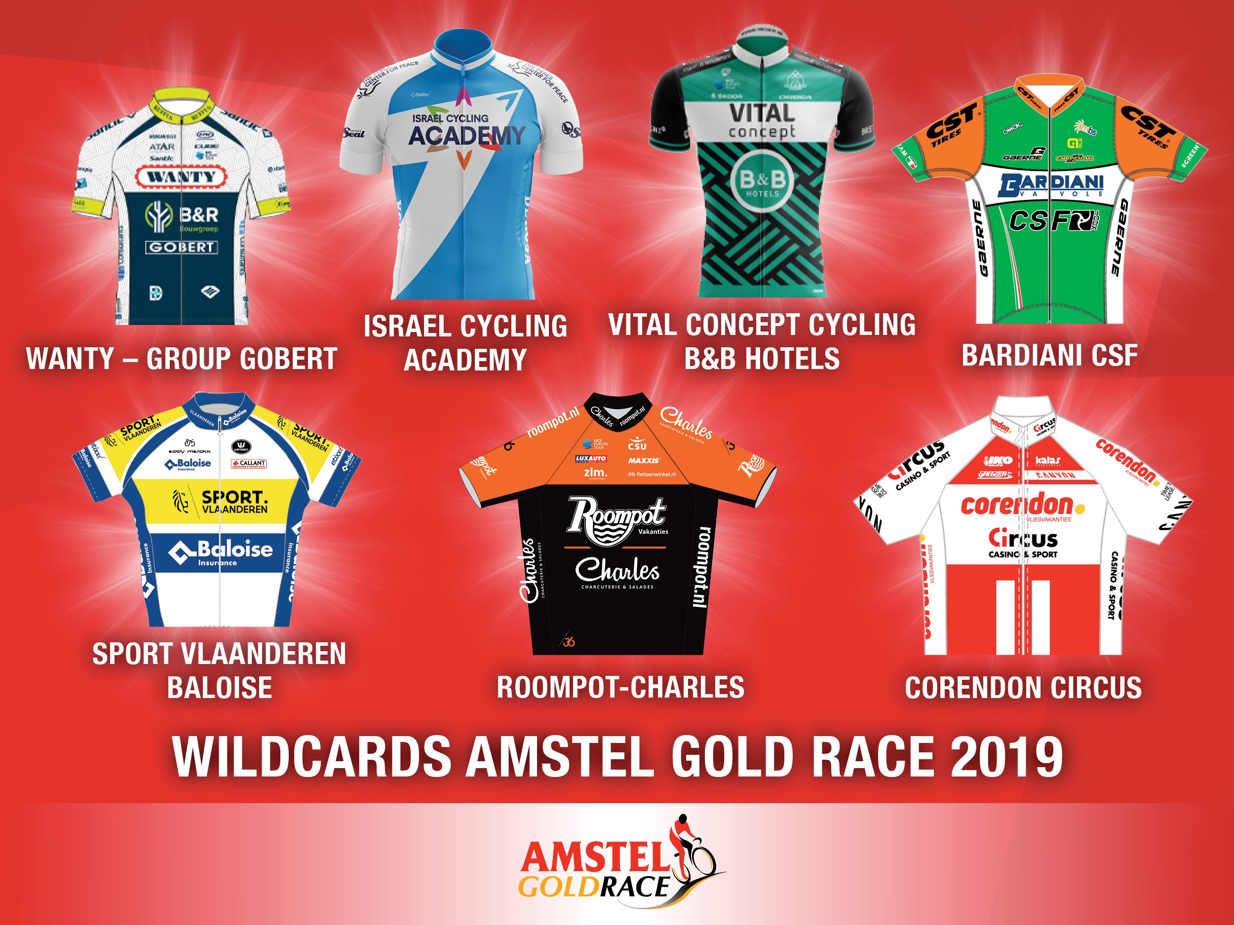 De organisatie van de Amstel Gold Race heeft de 7 wildcards voor de enige Nederlandse wielerklassieker, die dit jaar op zondag 21 april verreden wordt, bekend gemaakt. Aan de start van de 54e Amstel Gold Race verschijnen naast de 18 automatisch startgerechtigde WorldTour-ploegen ook de Procontinental-formaties van Corendon Circus, Roompot-Charles, Wanty - Groupe Gobert, Israel Cycling Academy, Sport Vlaanderen - Baloise, Bardiani CSF en Vital Concept Cycling B&B Hotels. In de loop van december 2018 werd al duidelijk dat Corendon Circus zou deelnemen met kopman en kersverse wereldkampioen in het veld, Mathieu van der Poel. Daarnaast komt Roompot – Charles, een van de vaste waarden in de Amstel Gold Race om de koers hard te maken, hoogstwaarschijnlijk met een sterke ploeg voor de dag. Ook Wanty - Groupe Gobert verschijnt aan de start van de 54e Amstel Gold Race en hoopt het kunstje van 2016 nog een keer te herhalen, toen Enrico Gasparotto in dienst van de Belgische wielerploeg wist te winnen.