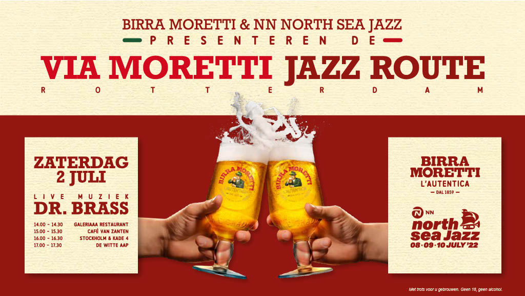 Op zaterdag 2 juli brengt Birra Moretti in samenwerking met NN North Sea Jazz een muzikaal spektakel naar de Rotterdamse straten. Via Moretti is een voorproefje op het jaarlijkse muziekfestival NN North Sea Jazz, dat een week later in de havenstad plaatsvindt. Tijdens Via Moretti kun je op verschillende locaties in de stad een unieke muziekervaring beleven. Onder leiding van Dr. Brass, een achtkoppige brassband met energie voor tien, reist de karavaan over de Via Moretti langs vier verschillende restaurants en kroegen met een Italiaans tintje.