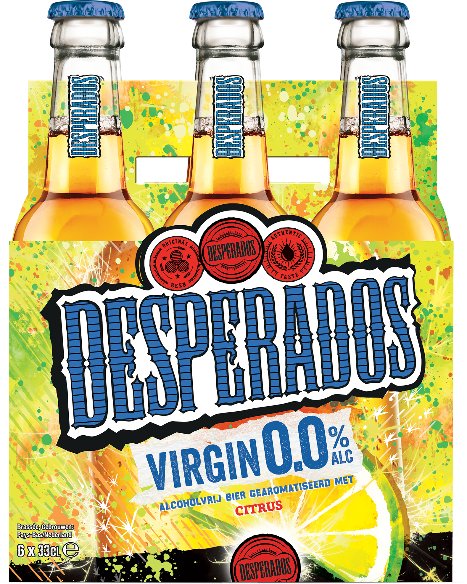 Desperados komt voor het eerst met een alcoholvrije variant in Nederland. Met Desperados Virgin 0.0% wordt ingespeeld op de sterk toenemende vraag naar alcoholvrije producten. Want niet alleen tijdens ‘Dry January’, maar ook in rest van het jaar kiezen steeds meer mensen ervoor om het soms wat kalmer aan te doen met alcohol. Desperados Virgin 0.0% biedt ook zonder alcohol de verfrissende smaak en de kick waar het merk bekend om staat. Het is hiermee een heerlijk alternatief voor mensen die even wat anders willen op een feestje of het terras. Deze introductie is in lijn met de strategie van moederbedrijf HEINEKEN Nederland dat voor ieder merk een alcoholvrije variant in het portfolio wil hebben zodat er voor de consument altijd een keuze is. Desperados Virgin 0.0% is bij Albert Heijn verkrijgbaar en zal over een aantal weken ook in de horeca en bij andere supermarkten verkrijgbaar zijn.