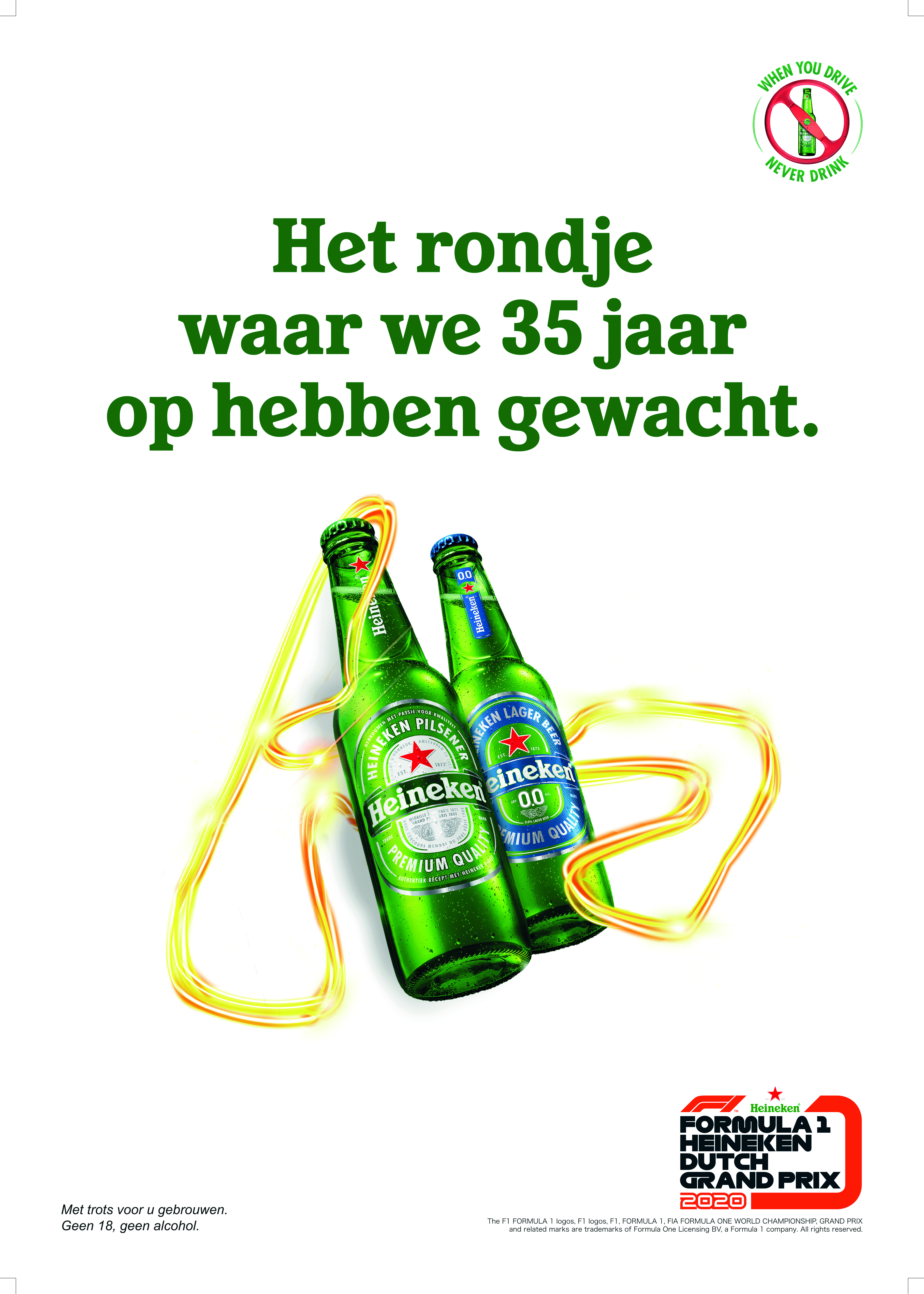 Binnen het Formule 1 partnership heeft verantwoorde alcoholconsumptie een prominente plek. Heineken gebruikt Formule 1 als platform om de boodschap over verantwoord alcoholgebruik in het verkeer op een aansprekende manier onder de aandacht te brengen. In de afgelopen jaren zijn diverse campagnes gelanceerd met Formule 1 helden zoals Jackie Stewart, Nico Rosberg en David Coulthard. Daarnaast heeft Heineken in Nederland, in samenwerking met Veilig Verkeer Nederland en Robert Doornbos, op verschillende momenten verantwoord alcoholgebruik onder de aandacht gebracht. Door goed gedrag te belonen en zo consumenten te stimuleren niet met alcohol op achter het stuur te stappen. Ook rondom de Grand Prix in Zandvoort zal de ‘When You Drive Never Drink’ campagne een passende invulling krijgen.