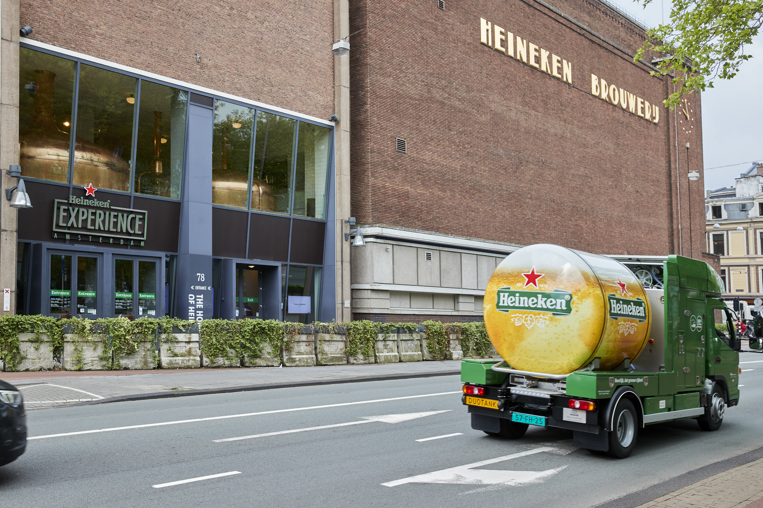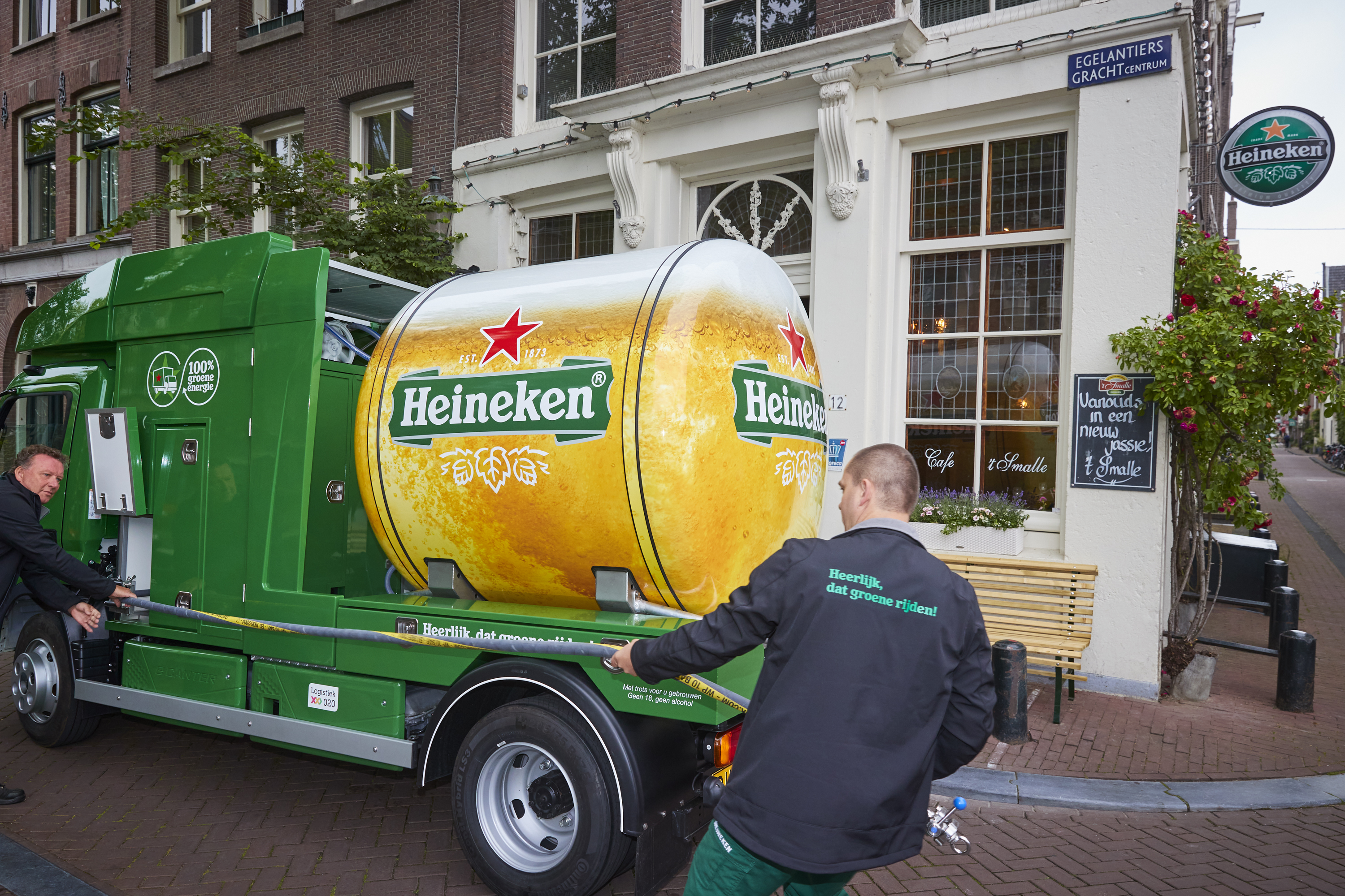 Elektrisch transport gaat niet zonder slag of stoot. Waar het in personenvervoer al behoorlijk gemeengoed is, is het in het goederensegment nog zoeken naar voldoende trekkracht. Die ontwikkeling vindt volop plaats. Dat neemt niet weg dat het gewicht van de lading vooralsnog verdeeld moet worden over meerdere wagens en ritten. Die vlieger gaat ook op voor Heineken; vanuit de brouwerij in Den Bosch rijdt een grote vrachtwagen met 200 hectoliter vers bier naar de rand van de stad. Daar wordt 30 hectoliter overgepompt naar de kleinere en 100% elektrische tankbiertruck die fluisterstil en zonder uitstoot circa vijf cafés van vers Heineken, Amstel of Brand bier voorziet. Eenmaal leeg zal de truck aan de rand van de stad weer stroom en bier gaan tanken om z’n weg naar het historische hart van de stad te vervolgen. De nieuwe trucks zijn een stuk lichter dan hun voorgangers en voldoen aan de norm van maximaal 7.5 ton om kades en bruggen te beschermen. In deze eerste fase zullen er in Amsterdam twee elektrische tankbiertrucks rijden. Heineken is voornemens om komende jaren het wagenpark voor stadsdistributie schoner en geluidsarmer te maken.