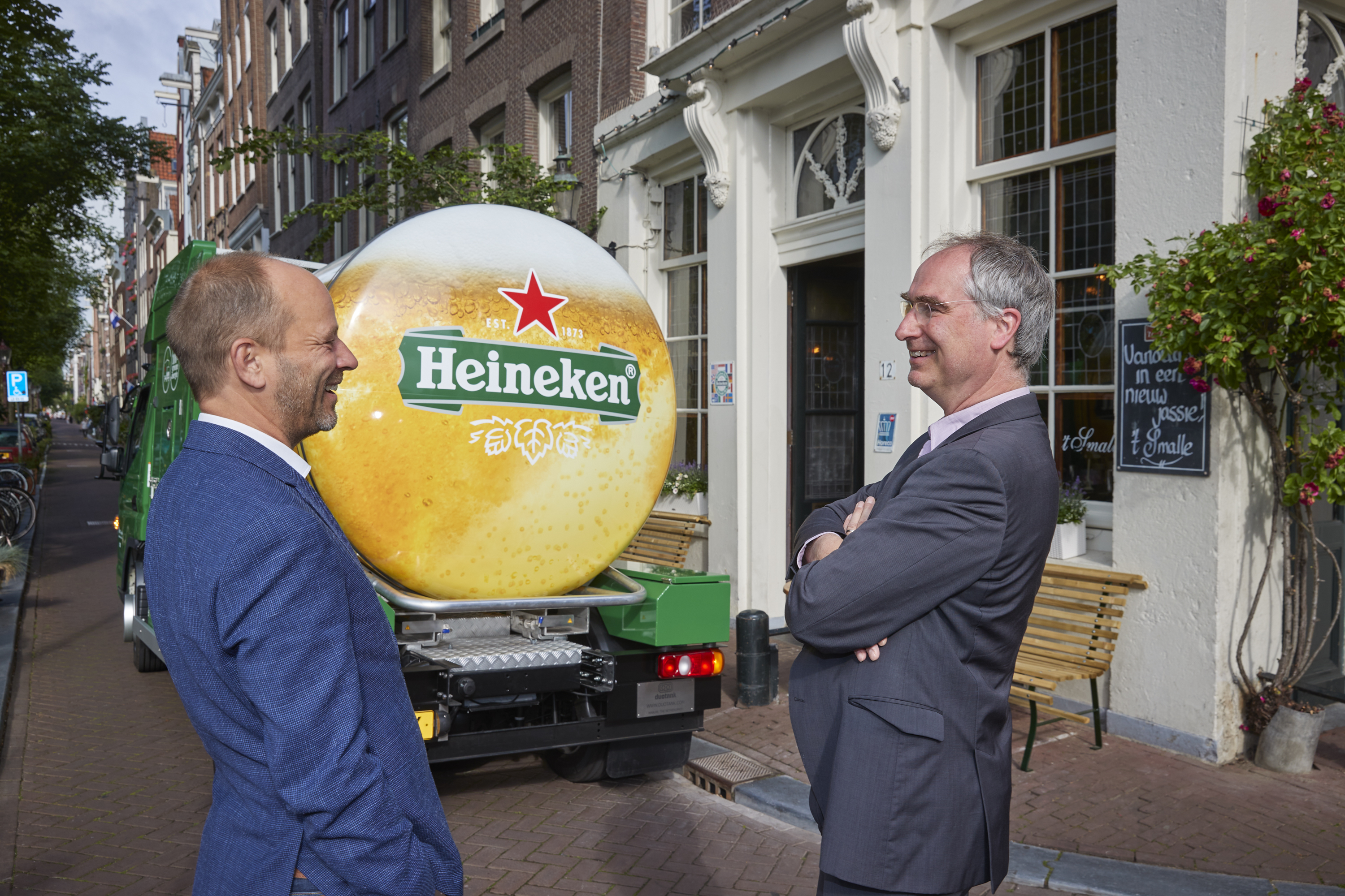 Vanaf vandaag bevoorraadt bierbrouwer Heineken cafés* in de Amsterdamse binnenstad met de allereerste elektrisch aangedreven mini tankbiertruck ter wereld. Als het aan de brouwer ligt zijn dieseldampen in het historische hart verleden tijd. “Heineken heeft een sterke groene ambitie en hierbij kijken we naar de hele keten. Dat gaat uiteraard ook over schoon transport. Ik ben blij dat we een groot gewicht zoals tankbier nu duurzaam kunnen vervoeren”, aldus algemeen directeur Hans Böhm. Het gaat niet alleen om uitstoot en roetdeeltjes, ook de decibellen worden flink teruggedrongen want de nieuwe elektrische truck is fluisterstil. “Deze nieuwe wijze van vervoeren komt de leefbaarheid voor iedereen die in de binnenstad woont, werkt of bezoekt ten goede. Bijkomend voordeel is dat dankzij deze sprong voorwaarts je nog beter kan genieten van een biertje op bijvoorbeeld een terras. Ik hoor liever lachende mensen en mooie muziek dan een ronkende motor die ook nog eens stinkt en verstikt.” De tankbiertruck is kleiner dan zijn voorganger en daardoor veel wendbaarder; dat is fijn voor de chauffeur maar het is ook voordelig voor de verkeersveiligheid. De tankbiertruck voedt zich met groene stroom en hiermee doet Heineken de ‘huiskleur’ nog meer eer aan dan het al deed. Vorig jaar augustus werd bekend dat al het Heineken® bier voor de Nederlandse markt 100% groen wordt gebrouwen. Dat daar nu ook verduurzaming van het transport aan wordt toegevoegd is een mooie mijlpaal en een opmaat naar meer schone kilometers.
