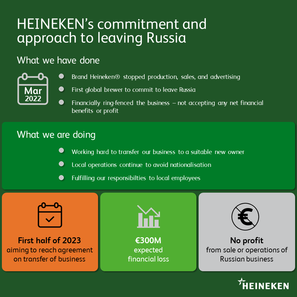 HEINEKEN is committed to leaving Russia and we’re doing everything we can to find a suitable new owner for our business while taking care of our local employees.