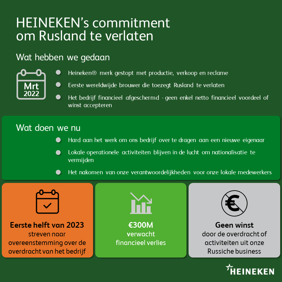 - No financial gain – we’ve financially ring-fenced the business – meaning no money is going into Russia and no money is going out. This means no royalties, no fees and no dividends are paid to the HEINEKEN Group from Russia. We don’t profit from the ongoing operations and we won’t profit from the transfer of ownership. We actually expect a loss of approximately €300 million.