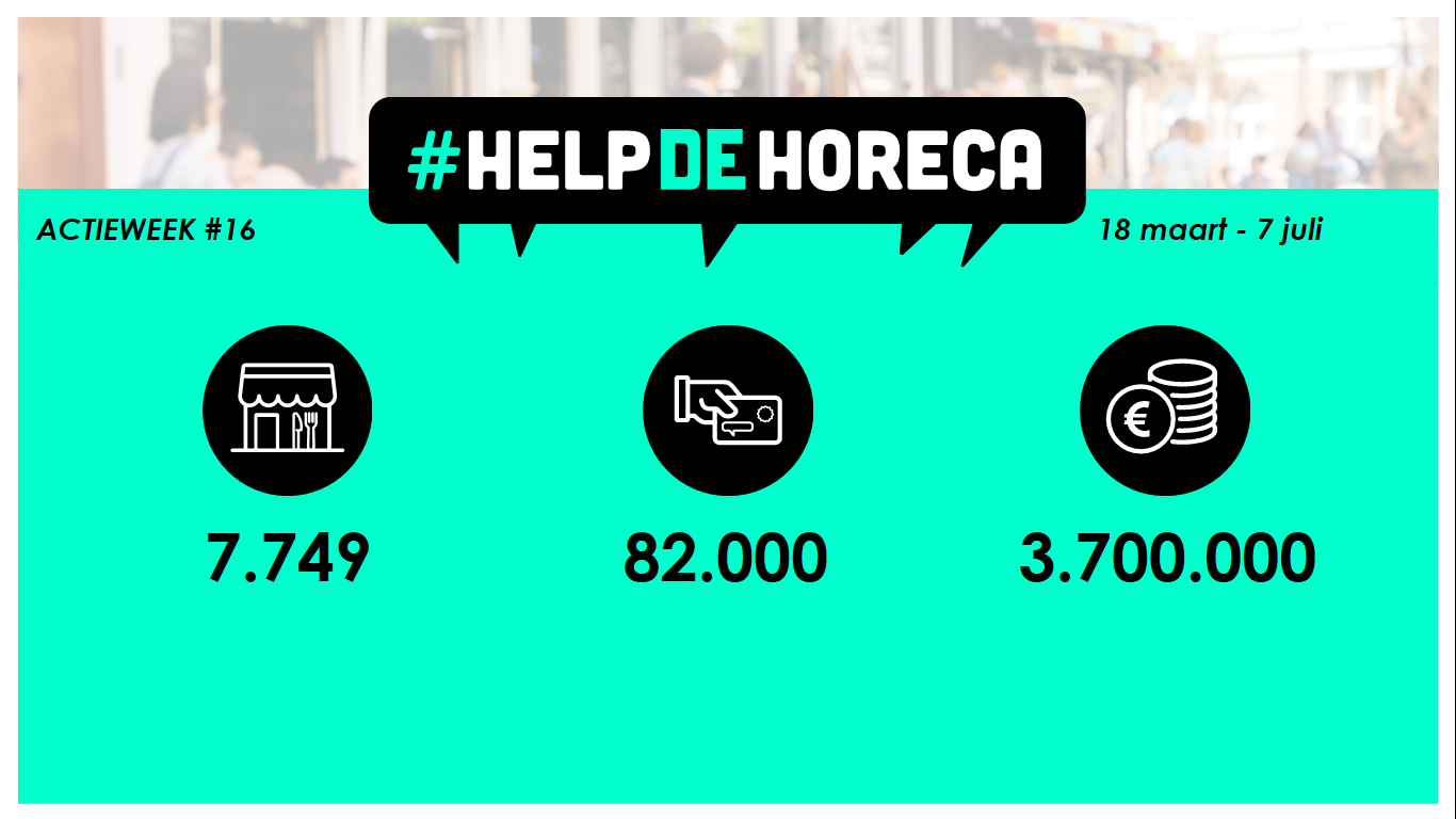 Het initiatief ‘Help de Horeca’ heeft maar liefst €3,7 miljoen opgeleverd voor horecazaken in Nederland. Sinds de start van het initiatief ruim elf weken geleden, zijn meer dan 80.000 waardebonnen aangeschaft door horecaliefhebbers in heel Nederland. Een prachtig resultaat, waarmee alle deelnemende partners gezamenlijk horecaondernemers van circa 8000 horecazaken een hart onder de riem hebben kunnen steken. De actie is deze week geëindigd. Gasten kunnen inmiddels weer genieten van mooie momenten in hun favoriete restaurant of café en de aanschafte waardebonnen kunnen verzilverd worden.