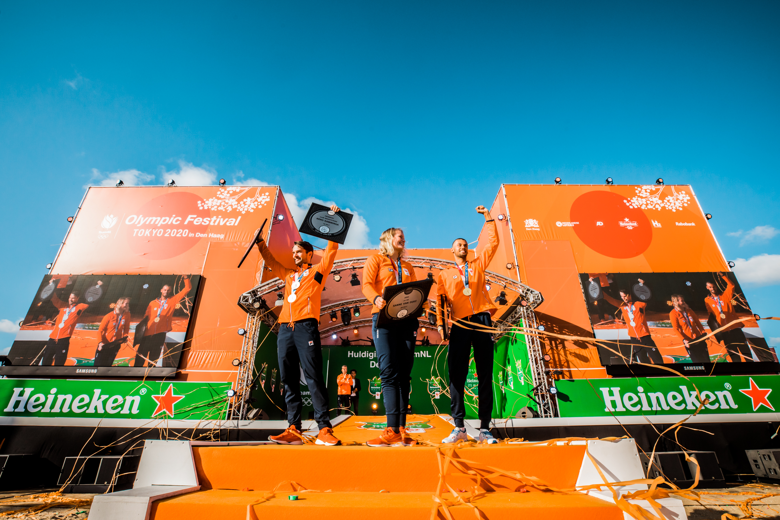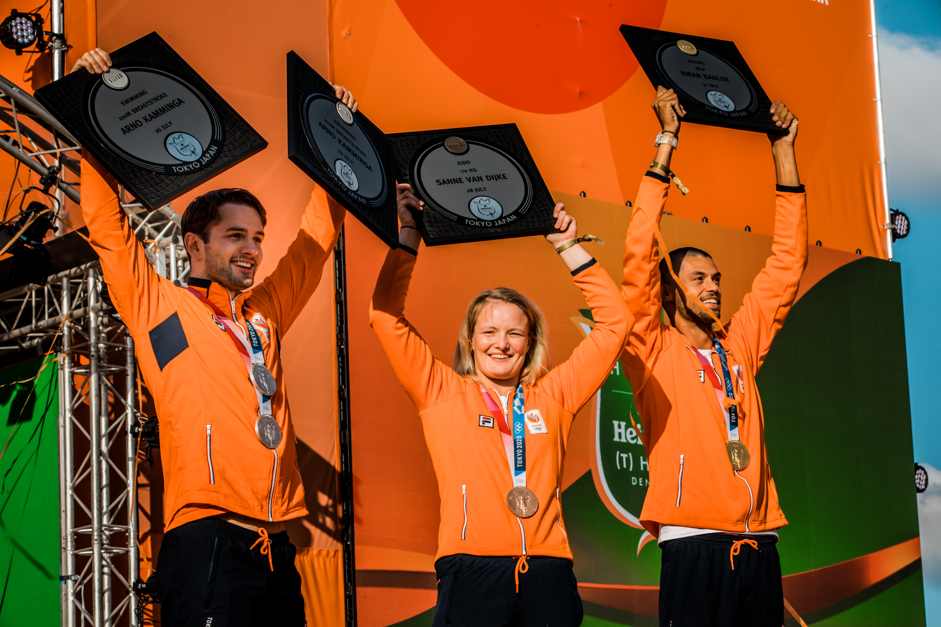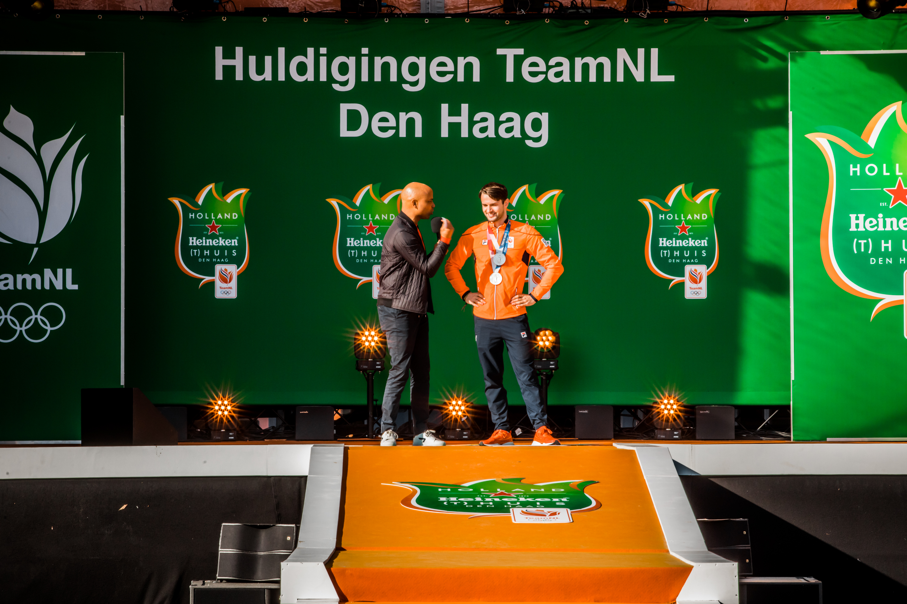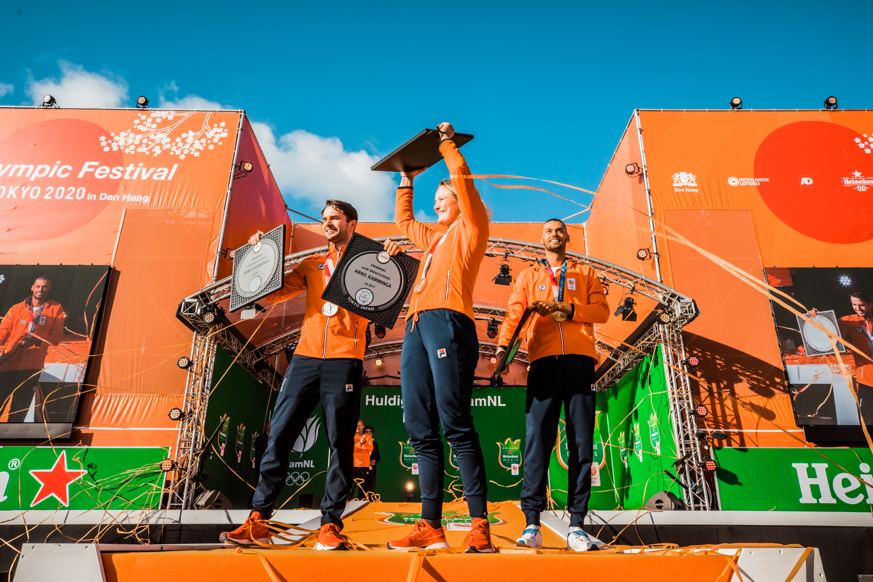 Kiran Badloe, Arno Kamminga en Sanne van Dijke zijn vanavond gehuldigd in Holland Heineken (t)Huis. In het zonnige Scheveningen werden zij door honderden enthousiaste familieleden, vrienden en fans onthaald.