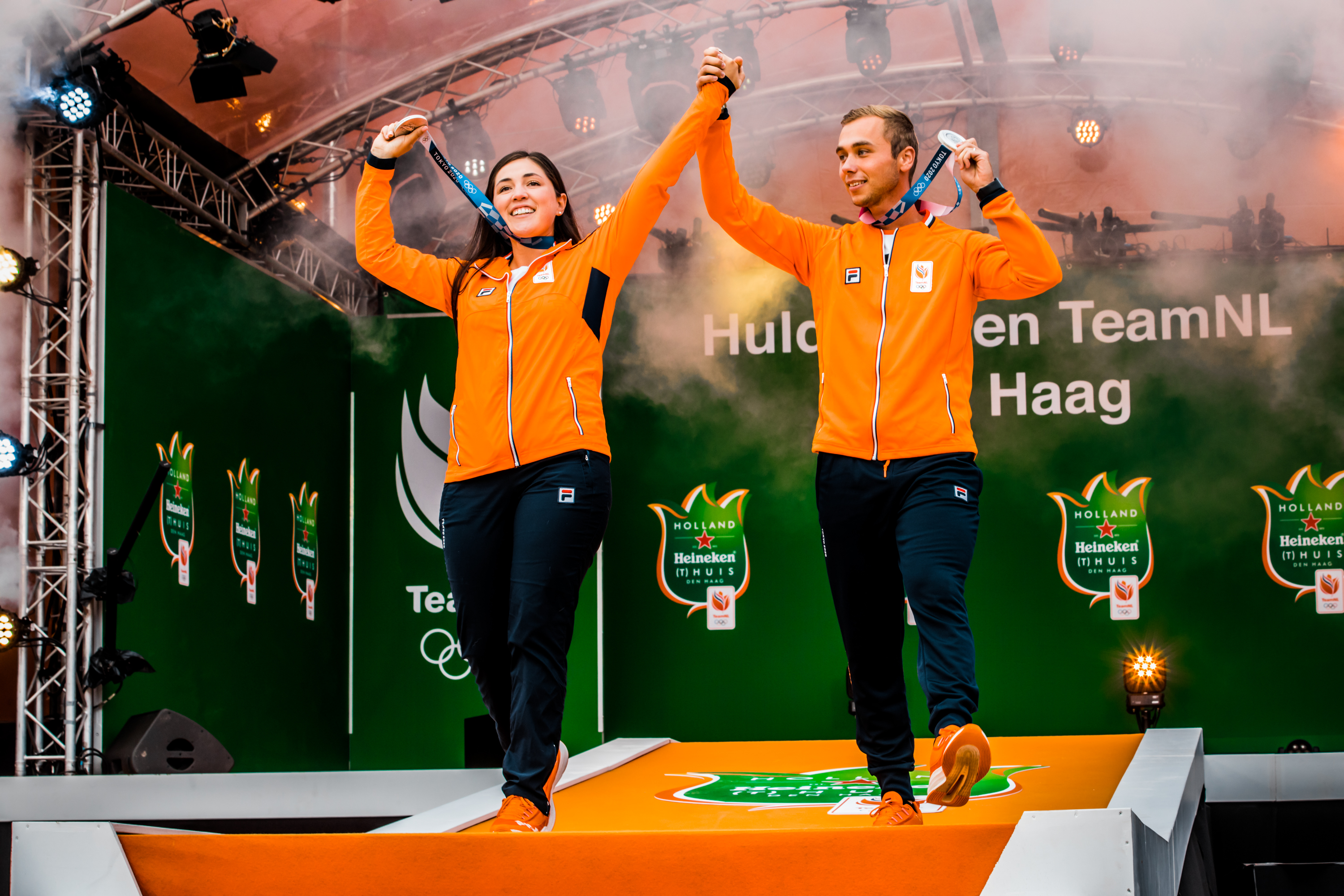 Steve Wijler en Gabriela Schloesser wisten op 24 juli de eerste medaille voor Nederland te pakken in Tokyo. Ze verloren in de finale nipt van Zuid-Korea. Gabriela, van oorsprong Mexicaanse, deed eerder mee aan de Spelen in Rio onder haar meisjesnaam Bayardo. Daarna trouwde ze met handboogschutter Mike Schloesser en sindsdien komt ze uit voor Nederland. Samen met Steve Wijler haalde zij de eerste zilveren plak voor TeamNL. Gabriela was direct in tranen toen zij het podium betrad in Scheveningen. "Ik ben heel emotioneel. Dat er zoveel mensen zijn gekomen, had ik niet verwacht. Het is heel bijzonder." De tegel werd uitgereikt door de man van Gabriela, Mike Schloesser: "Ze trainen er erg hard voor en je ziet de passie voor de sport ook in het schieten. Ik ben super trots op jullie. Deze medaille moest gewoon komen."