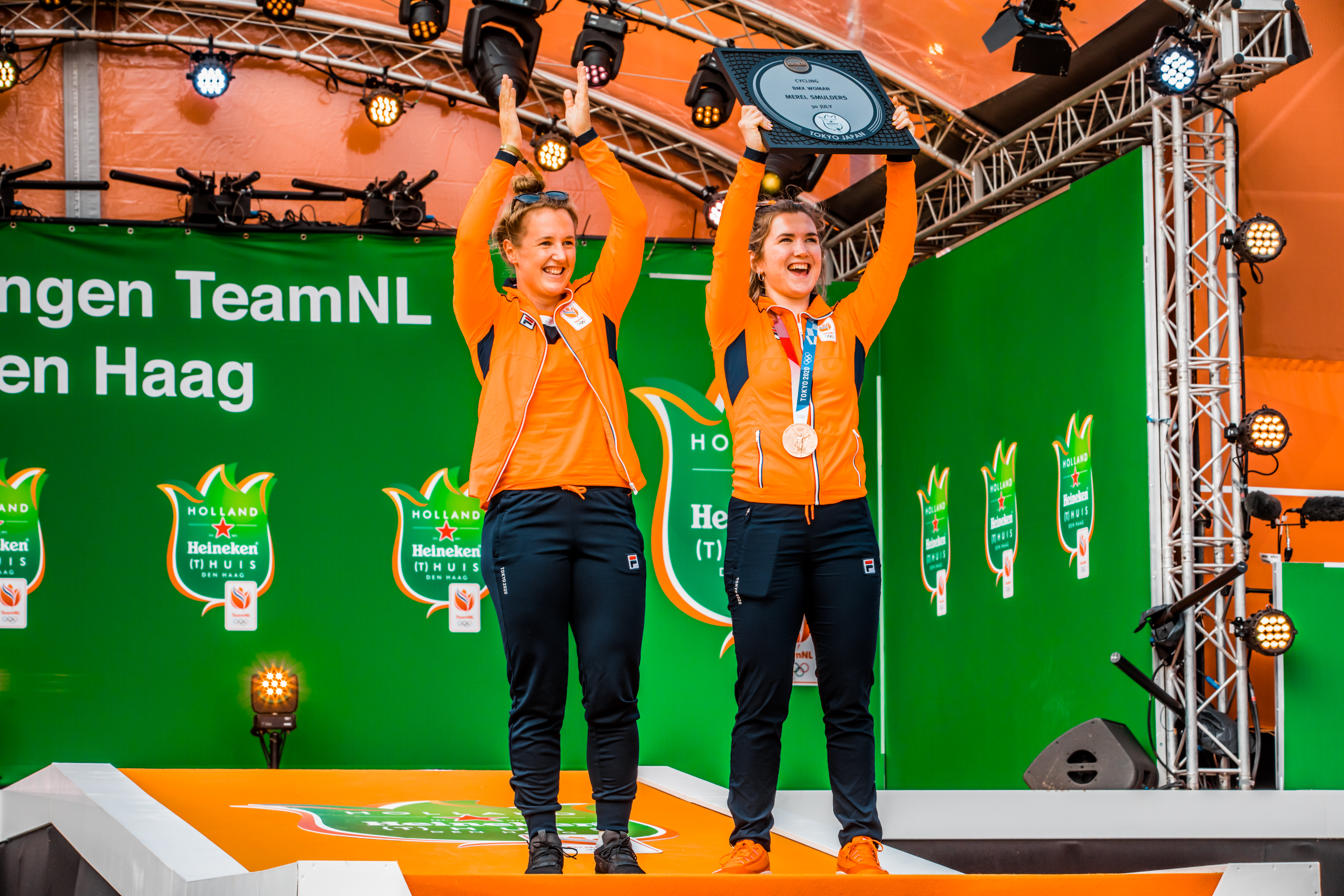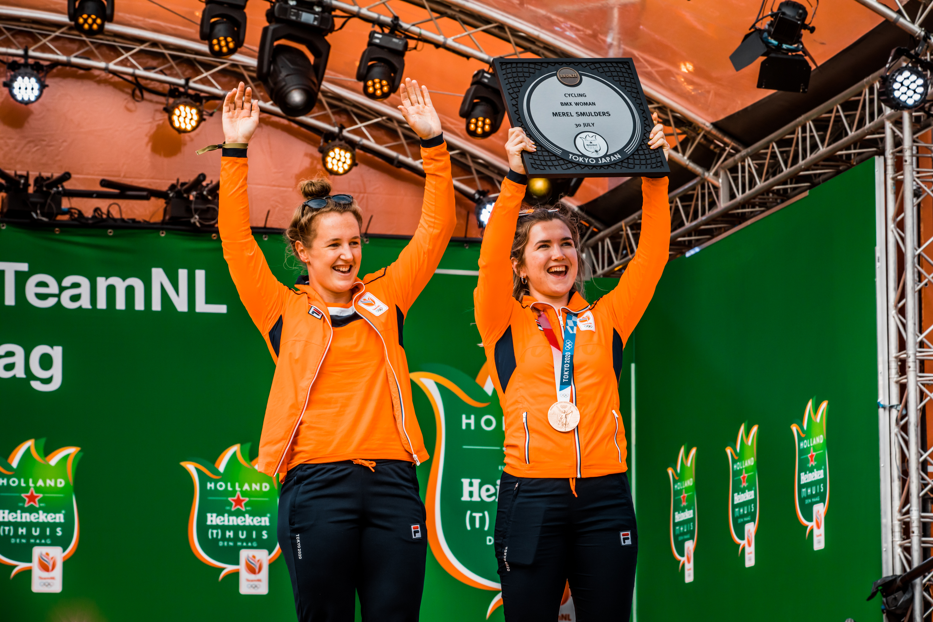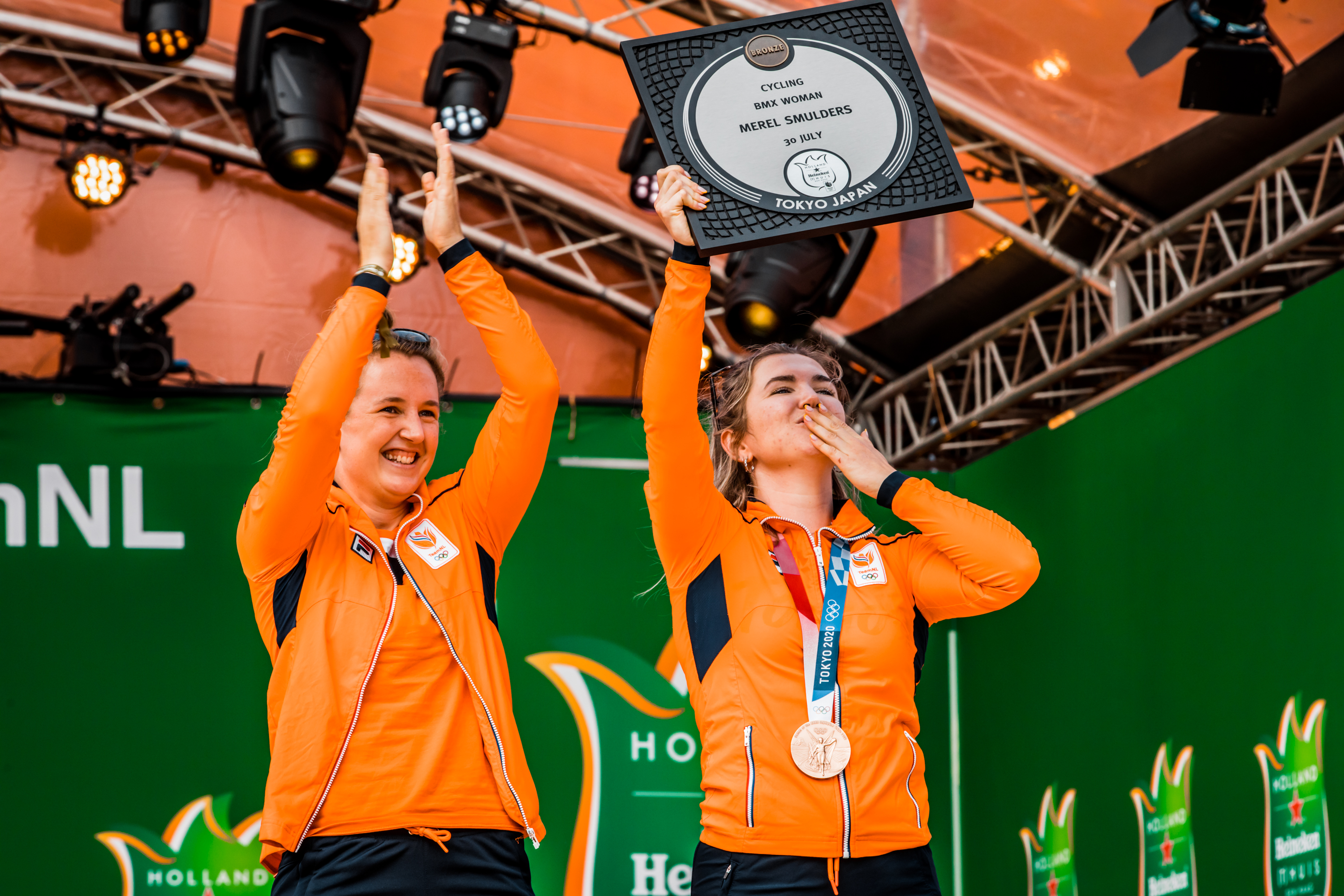 Opnieuw werden vanavond drie Olympische medaille winnaars gehuldigd in het Holland Heineken (t)Huis op het TeamNL Olympic Festival in Den Haag. Merel Smulders kreeg de tegel uitgereikt van haar zus Laura, die eerder al een bronzen medaille veroverde in Londen. Zelf viel topfavoriet Laura in de eerste run van de halve finale. Ze was tot tranen geroerd toen haar zus Merel in haar voetsporen trad door als derde over de finish te komen in de finale in Tokyo. In het Holland Heineken (t)Huis sprak ze haar zus lovend toe: "Ik wilde heel graag samen de finale fietsen. Ik ben gigantisch trots op je. We zijn niet alleen de Smulders sisters maar ook de bronzen sisters. Je moet super trots zijn op jezelf. Je verdient deze medaille echt."