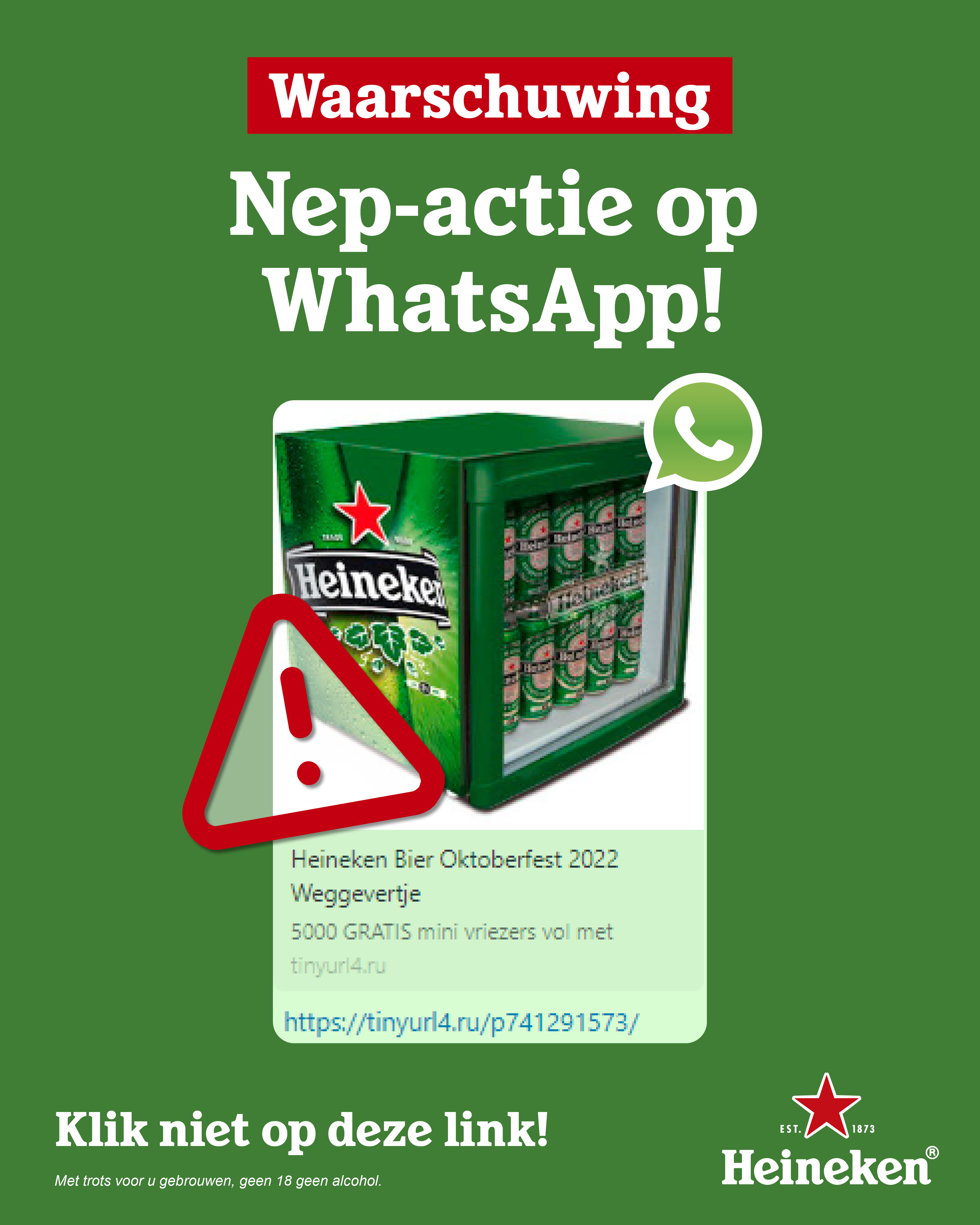 Er is een WhatsApp bericht in omloop, zogenaamd uit naam van Heineken, waarbij je kans maakt op gratis mini vriezers. LET OP, deze actie is niet van ons afkomstig, het gaat hier om een nep bericht. We raden je aan dit bericht te negeren en niet door te sturen als je het op WhatsApp of Social Media ontvangt. Mocht je toch hebben deelgenomen en/of hebben betaald adviseren we je om contact op te nemen met jouw bank.
